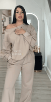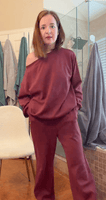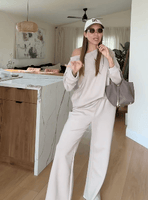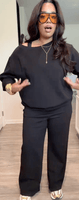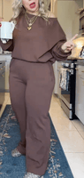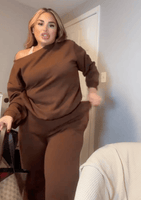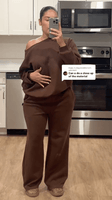 “I didn’t expect this material to feel THIS good. It’s like yoga pants mixed with the coziest sweatshirt ever. The wide-leg pants make my legs look longer, and the top drapes perfectly off the shoulder.”