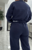 The cropped zip-up jacket offers easy layering, allowing you to wear it fully zipped for warmth or open for a more relaxed vibe. Paired with wide-leg sweatpants that feature an adjustable drawstring waist and deep pockets, this set gives you a comfortable fit that moves with you while maintaining its shape throughout the day. The high-rise pant design naturally elongates your legs, giving you a sleek silhouette with zero effort.