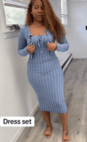 Elevate your everyday style with this beautifully crafted two-piece set, combining a soft ribbed bodycon dress with a matching button-front cropped cardigan. Designed for both comfort and shape, the stretchy knit fabric hugs your curves while allowing full freedom of movement, giving you a sleek, sculpted silhouette without ever feeling tight. The cardigan adds a polished finishing touch, making the outfit effortlessly wearable for casual days, cozy gatherings, or dressed-up evenings.